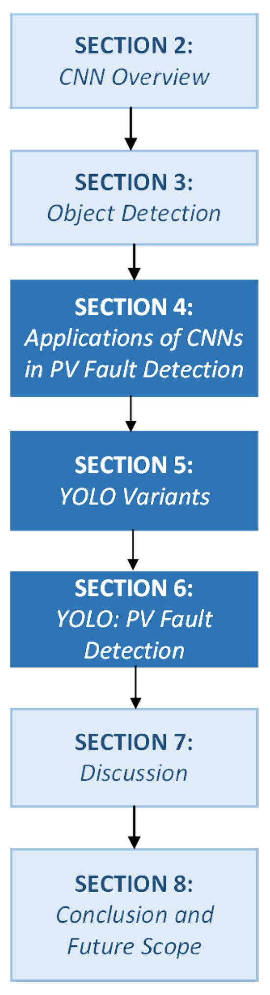This paper is subsequently divided into the following sections: Section 2 presents an overview of CNNs as a preliminary to facilitate readers’ understanding of the fundamental principles that stimulate the YOLO framework. Section 3 provides a detailed explanation of OD techniques to deliver a contextual background for the review. The subsequent section, Section 4, focuses on reviewing the application of CNNs in PV fault detection, encompassing an evaluation of research progress, challenges encountered, and opportunities within the field. Next, Section 5 explores the evolution of YOLO architectures comprehensively and coherently, investigating the modifications and advancements introduced in each successive iteration, from YOLOv1 to YOLOv10. This is followed by Section 6, which exclusively analyses the implementation of YOLO variants in PV fault detection applications. Section 7 discusses the findings of the review, culminating in a comprehensive assessment of the architecture’s suitability as a viable solution for autonomous PV fault detection. Finally, Section 8 coherently summaries the key points throughout the paper, offering a conclusive evaluation of YOLO’s potential and limitations in the context of PV fault detection. The visual representation of the review is illustrated in Figure 1.