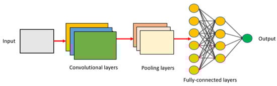 The core structure of a CNN, at its conceptual level, consists of a sequence of convolution, pooling, and activation functions that progressively transform the input into relevant outputs. Figure 2 presents a schematic representation of the core components comprising a convolutional neural network (CNN) at an abstract level. As depicted, the architecture consists of a sequential arrangement of convolutional blocks, culminating in a series of fully connected layers that ultimately produce the network’s output [79]. A crucial aspect of convolutional blocks within a CNN lies in the specification of the number of kernels (or filters) and their spatial dimensions. These parameters hold significant importance, as they directly govern the feature extraction process. Early layers extract low-level spatial features, setting the stage for subsequent layers to develop higher-order semantic representations [80]. The convolution operation involves the element-wise multiplication of the kernel and the overlapping patch of the input image, followed by summation. The mathematical formula for feature extraction is represented in Equation (1):