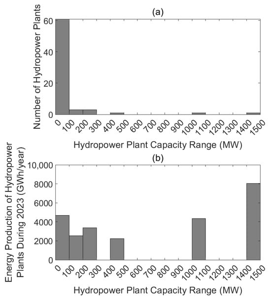 Histograms based on the hydropower capacities for (a) number of HPP plants, and (b) 2023 annual energy production.