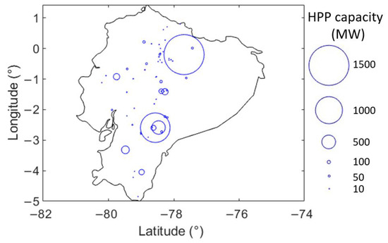 Hydropower plants’ locations in Ecuador. The circle size is linearly increased to represent the hydropower plant installation capacity, where the largest circle shows the 1500 MW capacity from Coca Codo Sinclair. Negative latitude values refer to the Western hemisphere, while positive longitude values refer to the Northern hemisphere.