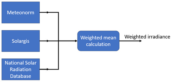 Figure 3 below illustrates the calculation process. It is important to note that while combining multiple datasets offers advantages in reducing the impact of potential inaccuracies from individual datasets, the calculated irradiance is determined by considering the weighted influence of spatial resolution and the number of years for each dataset. This approach ensures that datasets providing more reliable insights into the studied site are given greater priority in the final calculation.