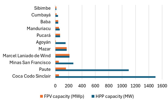 Additionally, Figure 5 provides a comparison between the installation capacities of the hydropower plants (HPPs) and their corresponding floating photovoltaic (FPV) systems. The figure shows that for HPPs such as Marcel Laniado de Wind, Mazar, Pucará, and Baba, the FPV capacity was constrained to align with the HPP capacity to avoid exceeding the limits of the existing electrical infrastructure. In contrast, HPPs like Coca Codo Sinclair, Paute, Minas San Francisco, and Agoyán exhibit a significant gap between their potential FPV capacities and the existing HPP capacity. This difference could be advantageous, as it may help minimize any potential strain on the electrical infrastructure, ensuring that the FPV systems do not exert excessive pressure on the grid.
