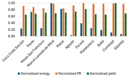 In Figure 6, the normalized values for energy production, performance ratio (PR), and yield are presented. It is evident that Marcel Laniado de Wind leads in energy production compared to the other systems, with Mazar and Paute following closely behind. This can be understood, as these achieve the highest FPV installation capacity among all sites. However, when assessing operational efficiency, Pucará stands out with the highest PR, which is comparable to most other systems. In contrast, Mazar and Minas San Francisco exhibit the lowest PR values, primarily due to significant losses from factors such as far shading and soiling. In terms of yield, Cumbayá takes the top spot, outperforming all other sites by a considerable margin. This exceptional performance is attributed to its high PR value and optimal site conditions, including one of the highest inclined irradiance levels, which enhances the overall energy production potential.
