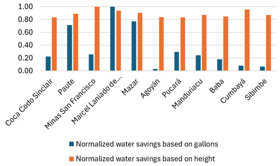 - With respect to water savings, the Marcel Laniado de Wind site produces the highest annual savings (6321 gallons/year), which is beneficial for HPP operations. Mazar (4870 gallons/year) and Paute (4498 gallons/year) also demonstrate significant savings. In terms of water savings per unit area, Minas San Francisco and Cumbayá exhibit the highest potential, at 0.84 m/year and 0.80 m/year, respectively.