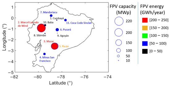 The map shows the locations of selected hydropower plants in Ecuador for potential FPV deployment. The size of each circle is proportional to the FPV installation capacity, while the color represents the FPV energy production potential. The names of the selected HPPs are also displayed, with each number corresponding to the FPV ranking based on this study. The color of the text matches the circle color for easy identification. Negative latitude values refer to the Western hemisphere while positive longitude values refer to the Northern hemisphere.