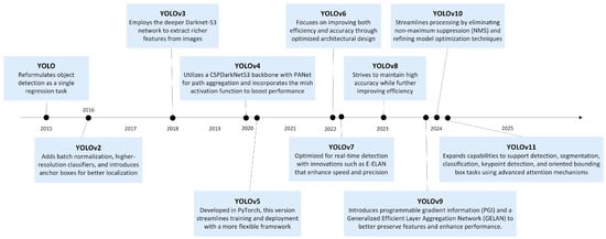 The YOLO object detection algorithm, introduced by Joseph Redmon et al. in 2015 [46], transformed real-time object detection by merging region proposal and classification into a single neural network, drastically reducing the computation time. Its unified architecture segments the image into a grid, allowing for direct predictions of the bounding boxes and class probabilities for each cell, facilitating end-to-end learning. YOLO’s real-time detection capabilities have had a profound impact across various domains, including agriculture [47], medical object detection [48], autonomous vehicles [49], security and surveillance systems [50], and industrial manufacturing [51], where both accuracy and speed are critical. The algorithm has evolved significantly, with the latest iteration being YOLOv10, showcasing improved performance in terms of the FPS and mAP across successive versions up to YOLO11. The timeline in Figure 1 illustrates the evolution of YOLO, tracing its development from the initial release to the most recent version, YOLO11.