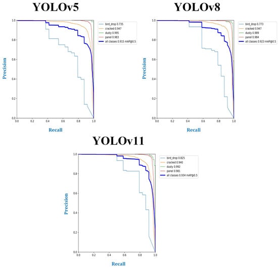 Bird drop detection remained challenging. YOLOv11 achieved the highest mAP@0.5 of 82.5%, outperforming YOLOv8 (77.3%) and YOLOv5 (73.5%). The precision–recall (PR) curves (Figure 5) illustrate this trend, with YOLOv11 demonstrating a higher precision and recall across most confidence thresholds for this defect. For dusty defect and normal panel detection, the precision values were consistently maintained above 98%, reinforcing their distinct and recognizable features.