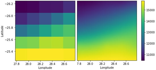 Study area with on the left side original ERA5 resolution at 25 km and on the right side new resolution at 1 km, for the z variable.