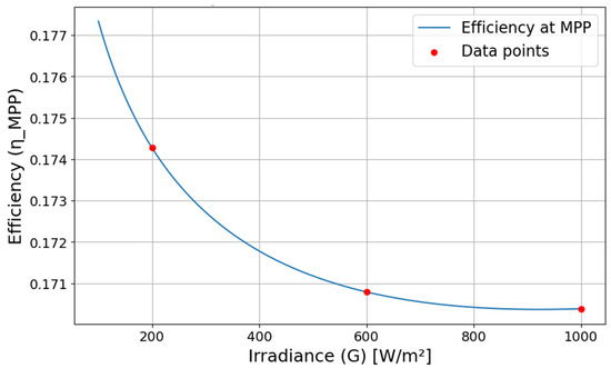 where is the maximum power at irradiance G, and w, l are the physical width and length of the solar panel. By choosing irradiation levels (G) at 1000, 600, and 200 W/m², and calculating their corresponding efficiencies, the efficiency curve in Figure 4 is generated using Equation (12). Efficiencies at the initially selected irradiation levels are shown in red markers.