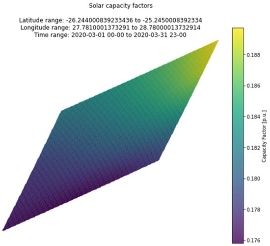 Average solar capacity factors for the study area with orthographic projection for date range 1 March 2020 to 31 March 2020.