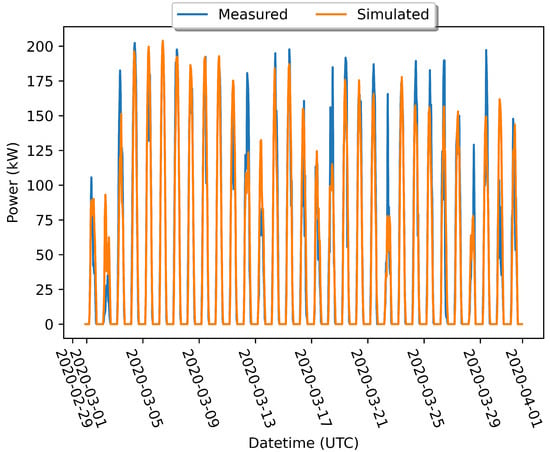 The calculated average solar capacity factors and the installation layout (cutout) were used in conjunction with the PV panel attributes and orientation to determine the solar power generation time series at the installation site and timeframe of interest. This power generation time series is compared with observed power generation data in Figure 6, resulting in a root mean square error (RMSE) of 19.6 kW for an installation with a kWp of 250 over a period of 1 month.