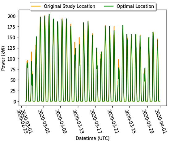 An alternative approach is to use the capacity factor map to identify the optimal location within a specified area. In Figure 7 the same solar setup simulated in Figure 6 is simulated at the pixel with the highest capacity factor and compared to the simulated power generation at the installation site (orange). The difference in capacity factor between the original installation site (0.181) and the highest capacity factor (0.189) is shown in Table 1. These factors resulted in a total generated power of 33.6 MW for the original location versus 34.4 MW for the location with the highest capacity factor.