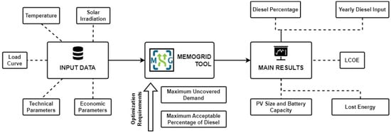 Figure 2 illustrates the structured workflow of the MEMOGRID tool, which integrates data collection, optimization requirements, and system evaluation into a comprehensive framework for microgrid planning. The process begins with input data collection, which includes the following: