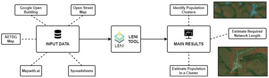 Figure 3 demonstrates the working principle of the LENI tool, which integrates geospatial data sources such as Google Open Building and Open Street Map to estimate population clusters, network lengths, and energy demand in rural areas. LENI applies clustering algorithms to identify population concentrations and pathfinding algorithms to determine optimal network routes along existing roads. Population estimates are further refined through comparisons with the provided data and geographical validation checks.