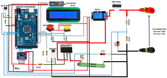 Figure 1 depicted the wiring diagram for the proposed device. It works as follows: after powering up, the panel to be characterized is connected to the device. Pressing the TEST button starts the characterization operation, which lasts about 10 s. The Arduino Mega first sends a control signal to the relay, which closes its contact, then generates a variable duty cycle PWM signal applied to the base of the 2N2222A bipolar transistor. The latter acts as a power interface for the IRLZ34NPbF MOSFET, used as a variable load. The shunt resistor is used to measure the current delivered by the panel, while the 150 kΩ and 12 kΩ resistors connected as a bridge divider are used to estimate the panel voltage. The LM35DZ temperature sensor measures the panel’s operating temperature. Additionally, 4.7 V Zener diodes protect the Arduino’s inputs from overvoltage, and the MBR10100 diode protects the device from reverse polarity. Once the characterization is complete, the Arduino sends a control signal to the relay, which this time opens its contact. The extracted parameters are then displayed on the 20 × 4 LCD screen. To save the data to the SD card, it is necessary to press the SAVE button. The input characteristics of the proposed system are listed in Table 1.