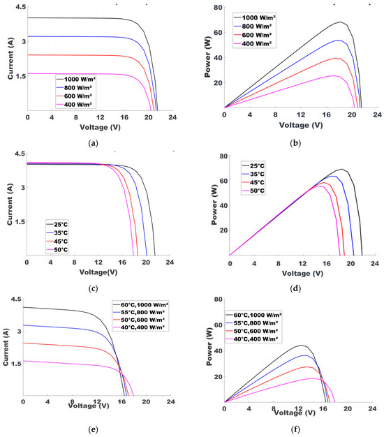 Characteristic curves for a 60 Wp PV module: (a,b) irradiance influences for T = 25 °C; (c,d) temperature influences for G = 1000 W/m2; (e,f) simultaneous variation of temperature and irradiance.