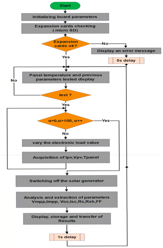 The organization chart consists of several key stages. First, during system initialization, the output pins for the PWM signal, current and voltage sensors, LCD display and SD card are defined. The duty cycle values are initialized, and tables are created to store voltage, current, and power values. Additionally, the PWM frequency is configured to match the characteristics of the solar pumping system and PV modules. Next, in the duty cycle variation stage, the algorithm decreases the PWM signal’s duty cycle in 0.5% steps from 100% to 0%, allowing sufficient time for stable measurement of electrical and meteorological parameters. At each step, the PWM signal is applied to the electronic load, modifying the electrical load at the photovoltaic module terminals to obtain various operating conditions. The third stage, data acquisition, involves measuring instantaneous values of current, voltage, temperature and irradiance whenever the electronic load varies. These measurements are recorded in data tables, associating each voltage and current value with the corresponding duty cycle and power. In the analysis and extraction of parameters stage, once the duty cycle reaches 0%, a control signal is sent to an electromagnetic relay to disconnect the generator from the dummy load. The algorithm then analyzes the recorded data to determine the maximum power point and its coordinates, the open-circuit voltage, the short-circuit current and other parameters such as series and parallel resistance and form factor. Finally, in the display, storage and transfer of results stage, the extracted key data is displayed on an LCD screen for real-time visualization. The data is then stored on an SD card and transferred to a smartphone application, allowing remote viewing of the I-V curve and extracted data.