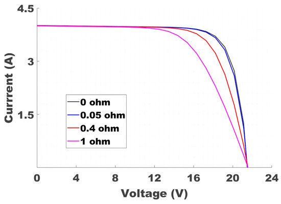 This is the internal resistance of the solar panel due to the materials and connections. A high series resistance reduces the panel’s efficiency by causing an internal voltage drop when a large current is generated. Series resistance mainly affects the I-V curve in the region where the voltage is high and the current is low (close to Voc) [4,21,22]. This portion of the I-V curve can be approximated by a linear relationship between V and I. Thus, the series resistance can be estimated from the derivative of the I-V curve in this region. Figure 5 displays the influence of series resistance for irradiance values of 1000 W/m2, at a temperature of 200 °C and a shunt resistance of 300 Ω.