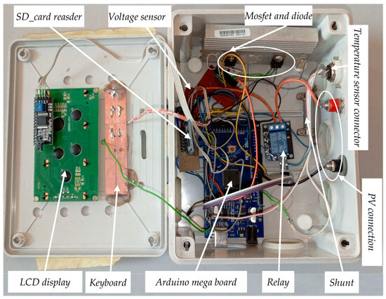 Figure 8 shows an internal view of our experimental prototype. It consists of an Arduino Mega, acting as the control interface, and a power interface driving the IRLZ34NPbF MOSFET (manufactured by Vishay Intertechnology in Pennsylvania in the United States of America) used as a variable load. The system also incorporates Zener diodes, a shunt resistor, various resistors, a man–machine interface button and the LM35DZ temperature sensor (manufactured by Microchip, a company based in the United States of America). The characteristics of the various components used are detailed in Table 4. As shown in Table 5, the total cost of the prototype is around EUR 50, and should fall in the event of mass production. Table 5 clearly demonstrates the cost-effectiveness of the proposed card compared to that of commercial devices, which generally use bulky and expensive charging capacitors.