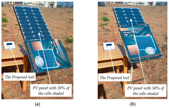 Several experiments were carried out to analyze the impact of sunlight conditions on the performance of the photovoltaic module. First, the photovoltaic module was fully exposed to light, as shown in Figure 7. Subsequently, some cells of the module were partially shaded in order to simulate the partial shading phenomena of 20% and 50%, shown in Figure 9a and Figure 9b, respectively.