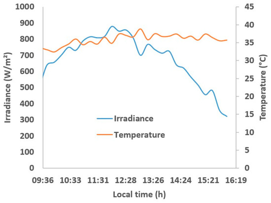 Figure 11 illustrates the evolution of solar irradiance and temperature over the experimental day. The blue curve represents irradiance (W/m2), which rose gradually in the morning, reaching a maximum around midday, and then fell gradually in the afternoon, following the solar cycle. The orange curve, representing temperature (°C), showed a more stable evolution: it rose slightly at the start of the day, remained relatively constant at around 35–40 °C despite irradiance variations, then began to fall later in the afternoon. This difference can be explained by thermal inertia, which means that temperature did not fall immediately after irradiance decreased. The figure shows the relationship between these two parameters, highlighting the time lag between peak irradiance and peak temperature.