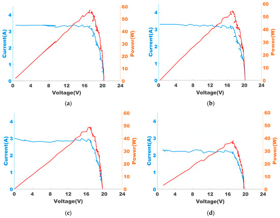 Experimental PV panel curves extracted under normal operation: (a) under clear skies with high irradiance; (b) unclouded skies with high irradiance; (c) under cloudy skies with high irradiance; (d) under cloudy skies with medium irradiance.