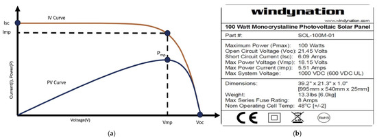Figure 1b shows an example of a commercial SP. According to the specifications of the 100-watt SP, the Pmax is 100 watts, which appears at the corresponding voltage and current values: VMP = 18.15 V and IMP = 5.51 A. The formula Pmax = VMP × IMP confirms this value [10]. In the specifications, the ISC is 6.09 A; any current above this value indicates a short-circuit (SC) condition in the SP [11,12]. Similarly, the VOC is 21.45 V, and from these values, the theoretical maximum power at VOC and ISC can be derived as VOC × ISC = 130.63 W. This yields maximum power at approximately 76.45% of this value. Any voltage beyond VOC suggests the SP is in an OC condition. Likewise, operating the cell at the MPP guarantees maximum efficiency from the SP, providing the most effective balance between voltage and current to maximize power. In contrast, operating the cell at ISC or VOC indicates a malfunction, as these conditions cause the SP to be short-circuited or open-circuited.