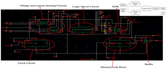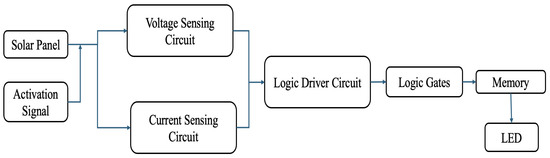 From an SP, we can derive the voltage (Vpv) and current (Vipv) to determine whether the solar panel is short- or open-circuited, as indicated in Figure 1a. Therefore, the proposed system is developed to detect both Vpv and Ipv from the SP utilizing a voltage-sensing circuit (VSC) and a current-sensing circuit (CSC), as shown in the block diagram. As shown in the Figure 2, the outputs from the VSC and CSC are integrated into a logic driver circuit (LDC) block that develops unique signals to decide whether the SP is experiencing an SC or an OC or working normally. The LDC further processes these signals, providing an XOR logic gate that outputs an errored signal when an SC or OC condition is detected. A memory unit at the output ensures the LED indicator stays ON until the noticed fault is fixed. A clock activation circuit is used to turn on the whole circuit. This work proposes a code implementation for the SPD FPGA, as suggested by the block diagram. ASIC circuitry is also implemented for each block diagram element [25].