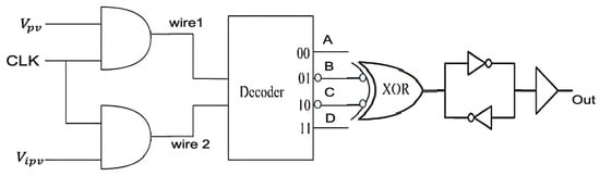 To implement code in an FPGA for the SP functionality test, a circuit with AND gates was taken for VSC and CSC, a decoder was taken for LDC, and an XOR gate was proposed for the logic gate. In two inputs for the AND gate, one input is given to Vpv/Vipv and another to the circuit activation system. AND gates are chosen for VSC and CSC because whenever the logic 1 (HIGH) or logic 0 (LOW) voltage comes from the solar panel, it will be projected at the output end when the circuit activation signal is also logic 1. The output is zero for both conditions of 1 or 0 of the SP when the circuit activation signal is 0. The VSC signal output is named wire 1, and from the CSC it is given as wire 2. This signal was given to the LDC, which is nothing but a decoder, and based on the signal from VSC and CSC, the LDC determines the output. LDC has four output signals for two inputs: A, B, C, and D [26]. If the signal from wire 1 and wire 2 is logic 0 and 0, then Decoder output signal A will give a logic 1 signal as the output. The rest of the signal outputs B, C, and D give logic 0. In the same way, for 01 from wire 1 and wire 2, the B signal gives 1 for 10, the C signal gives HIGH output, and for 11 combinations, the D signal gives 1. A decoder-based LDC was chosen for its simplicity and ability to map two input signals to four unique states. Compared to multiplexers or combinations of logic gates, the decoder offers a more compact and efficient solution with fewer transistors, making it ideal for both FPGA testing and ASIC implementation.