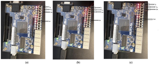 (a) FPGA LED6 displays defect detection out = On (for Vpv and Vipv Inputs: 01); (b) Y= On (Vpv and Vipv Inputs: 10); (c) FPGA LED6 Off (A and D switches are logic 0).