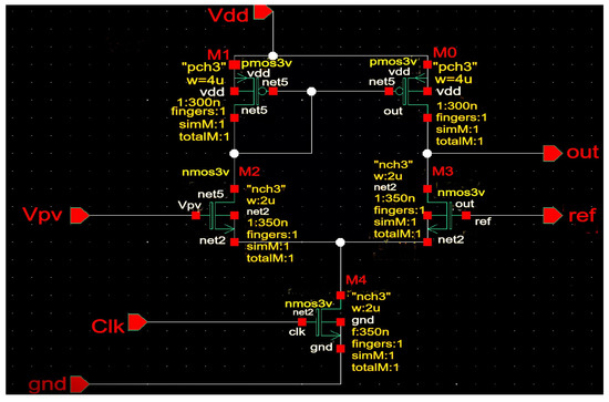 The PMOS devices in the DA are developed with a width of 4 µm and a channel length of 300 nm, while the NMOS devices are designed with a width of 2 µm and a channel length of 350 nm. A DA was chosen because it has three input pins; one can be used as a reference, and the other can receive input from the solar panel’s output [32].