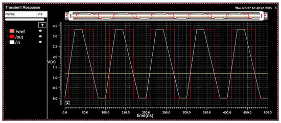 Since the signal from the solar panel is analogue, a triangular waveform is assumed to be a representative signal that can be produced for simulation and analysis. As shown in Figure 7, the DA successfully operates the 25 ns rise-time signal to logic HIGH 1 when the input signal crosses the reference voltage level and instantly pulls it to logic low when the triangular signal falls below the reference [34]. A 25 ns rise time corresponds to a frequency of 40 MHz, clearly indicating that the system can efficiently work at 40 MHz or higher. The designed DA provides a voltage gain of approximately 40 dB, which corresponds to a linear voltage gain of 100 (using the formula Gain (dB) = 20 log10(gain)). The amplifier also exhibits a bandwidth of 5 MHz, allowing it to respond quickly to signal transitions, which is more than adequate for solar panel diagnostics, where signal changes occur relatively slowly. Additionally, the input offset voltage is measured to be around 5 mV, indicating good transistor matching and ensuring the accurate detection of short-circuit (SC) or open- circuit (OC) conditions. The digitized result from the DA is then ready to be delivered to the next stage of the circuit, the LDC, for further analysis.