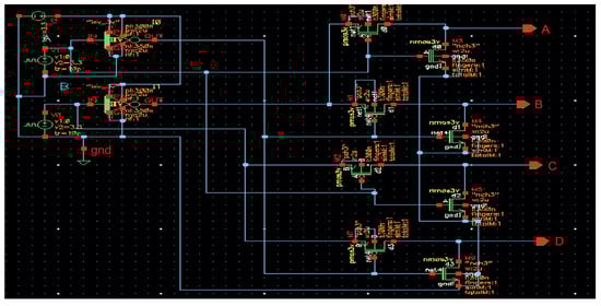 Once the digitalized signal from the DA is obtained, the LDC analyzes the SP state by processing the outputs from both the VSC and CSC. The LDC is developed to generate four types of signals, providing individual outputs for each possible combination of high and low states [34]. A 2 × 4 decoder can be used for this purpose. However, the decoder has 22 transistors, so to make the chip more compact, this work has proposed a circuit that acts the same as the decoder, which has 12 transistors, including 4 transistors used for two inverter circuits. Figure 9 shows the proposed 12-transistor Logic Driver Circuit [35]. This difference in the number of transistors yields very notable differences in area, power consumption, and manufacturing costs on a large scale.