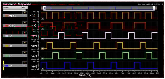 When both amplifiers output a low signal (VSC = 0, CSC = 0), the output gives HIGH for signal A, which is ignored, indicating no fault. If the VSC outputs a low signal and the CSC outputs a high signal (VSC = 0, CSC = 1), the output gives HIGH for signal B, indicating an SC. When the Voltage Sensing Amplifier outputs a HIGH signal, and the Current Sensing Amplifier outputs a low signal (VSC = 1, CSC = 0), the output makes signal C HIGH, signaling an OC condition [36]. Figure 10 provides the simulation results, demonstrating the logic driver circuit’s output for different input combinations.