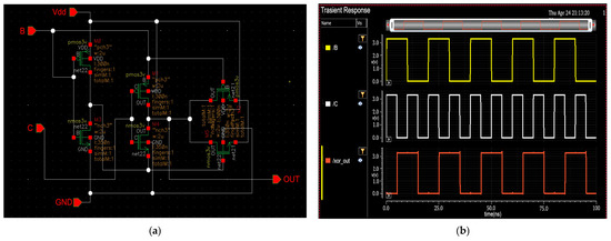The XOR (exclusive OR) logic gate is a digital circuit that outputs high only when the number of HIGH inputs is odd. The output of an XOR gate is logic 1 if exactly one of its inputs is HIGH [37]. This property makes the XOR gate particularly useful in applications such as error detection, correction, and decision-making circuits. Figure 11b presents the simulation results of the XOR circuit. Specifically, if the outputs corresponding to the OC and SC states (B and C signals) are applied to the XOR gate, it will produce a HIGH output when there is a discrepancy between the two signals [38,39,40]. The last signal in Figure 11b waveforms represents the output of the XOR gate, which is then fed into the next-state memory block. Usually, the XOR gate is designed using a minimum of 12 transistors.