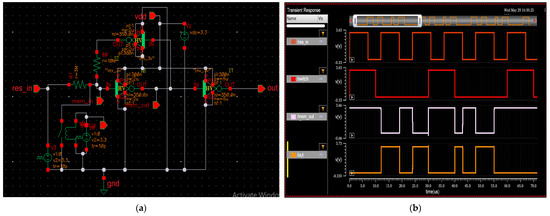 After completing the SPD functionality test with the FPGA, we can move forward with designing the implementation of the ASIC. All circuits were designed using Cadence Virtuoso, utilizing the TSMC (Taiwan Semiconductor Manufacturing Company, Hsinchu City, Taiwan, Republic of China) 180 nm technology library for component selection [28]. All the circuits were designed using the 3V functional devices, which operate reliably at 3.3 V. All the designs utilize basic components, such as PMOS, NMOS transistors and resistors [29].