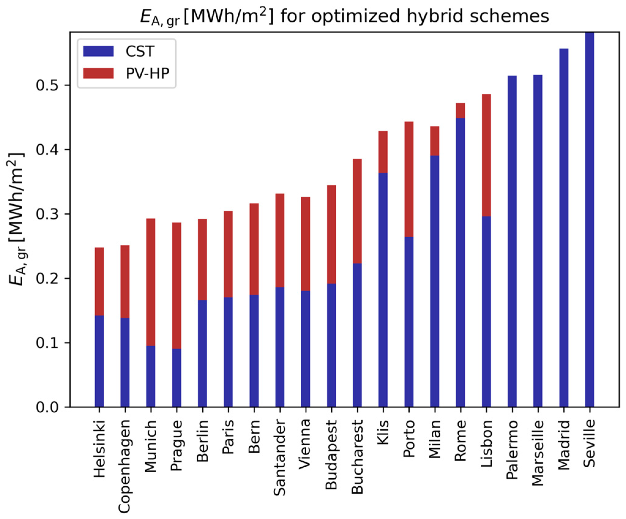 The hybrid solution CST/PV-HP allows for an increase in the amount of energy provided per unit of ground area with respect to the CST alone for all the central European locations considered. This is shown in