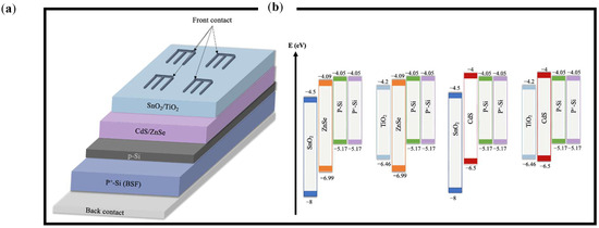 In this context, materials such as SnO2 (tin–tin oxide), ZnSe (zinc selenide), CdS (cadmium sulfide), and TiO2 (titanium dioxide) are a key factor in the manufacture of high-performance, long-lasting solar cells, with their particular qualities and affinity with modern photovoltaic technologies. Each material contributes to the enhancement of solar cells. SnO2 tin oxide is a transparent material that can be deposited as a thin layer on solar cells to allow sunlight to be transmitted to the active layers [14,15,16,17]. In addition, it is a good electrical conductor, making it easier to collect the electrons generated by the light [18,19]. ZnSe (Zinc Selenide) has an adequate energy gap for use as a buffer layer material or as a junction material in solar cells based in thin-film [20,21,22,23]. It can improve the effective conversion of sunlight to power. On the other hand, CdS is widely employed as a buffer layer in solar cells, as it allows a smooth transition between the absorber layer and the contact layer. It can also help to minimize the reflection of light from the cell surface [24,25,26]. TiO2 is commonly employed as a material for the front electrodes of solar cells, most notably in perovskite and dye-sensitized (DSSCs) solar cells. It promotes the transport of electrons generated by sunlight and can improve conversion efficiency [27,28,29]. However, P_Si and P+_Si layers are crucial for charge carrier transport, surface passivation, and energy band alignment, influencing key parameters such as open circuit voltage (), and power conversion efficiency [30,31,32]. An understanding and optimization of these materials is fundamental to achieving greater energy conversion efficiency and advancing the capabilities of photovoltaic technology. These materials are selected based on their specific properties, such as their band gap, electrical conductivity, transparency, chemical stability, and availability. Their appropriate use in solar cell design optimizes light absorption, charge collection, efficient carrier separation, and overall device durability.
