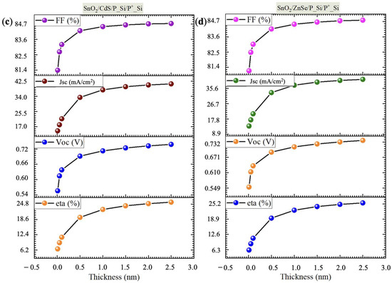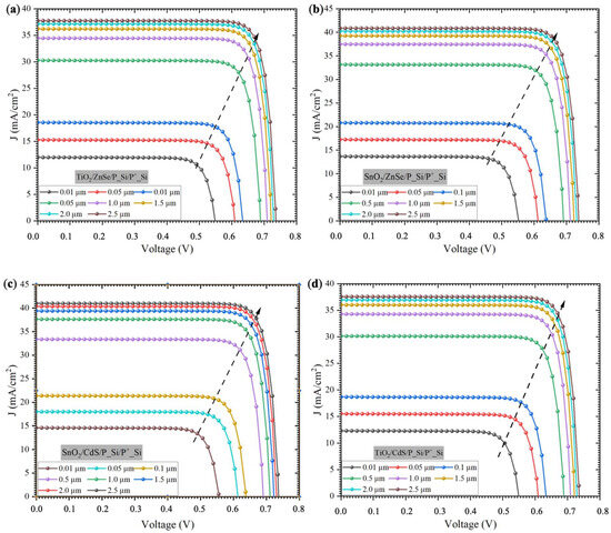 J-V characteristics of the proposed heterojunctions as a function of the thickness of the back surface field layer of (a) TiO2/ZnSe/P_Si/P+_Si, (b) SnO2/ZnSe/P_Si/P+_Si, (c) SnO2/CdS/P_Si/P+_Si, and (d) TiO2/CdS/P_Si/P+_Si.