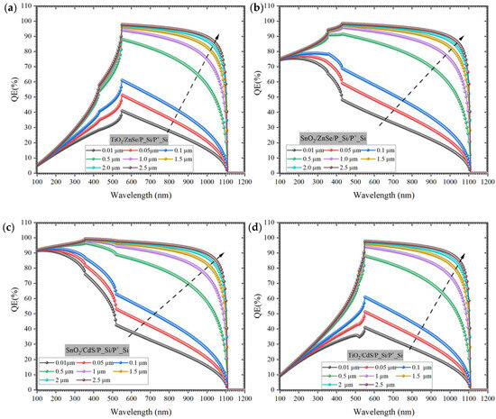 Quantum efficiency as a function of wavelength for different back surface field thicknesses of (a) TiO2/ZnSe/P_Si/P+_Si, (b) SnO2/ZnSe/P_Si/P+_Si, (c) SnO2/CdS/P_Si/P+_Si, and (d) TiO2/CdS/P_Si/P+_Si.