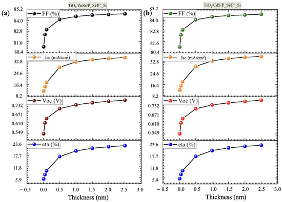 The impact of the doping concentration in the back surface field layer was also examined. Figure 5 illustrates the evolution of Voc, Jsc, FF, and the efficiency of photovoltaic cells as a function of the doping density in this layer. At first, it is important to note that all results remained relatively constant until the doping density reached 1014 cm−3, as shown in Figure 5. Thereafter, we observed an increase in Voc with doping density ranging from 1014 cm−3 to 1019 cm−3, reaching 0.74 V for SnO2/ZnSe/p_Si/p+_Si, 0.7 V for SnO2/CdS/p_Si/p+_Si and 0.74 V for TiO2/CdS/p_Si/p+_Si and TiO2/ZnSe/p_Si/p+_Si at 1019 cm−3. The observed behavior of the Jsc is inversely associated with that of Voc, demonstrating a decrease by increasing the doping density of the BSF.