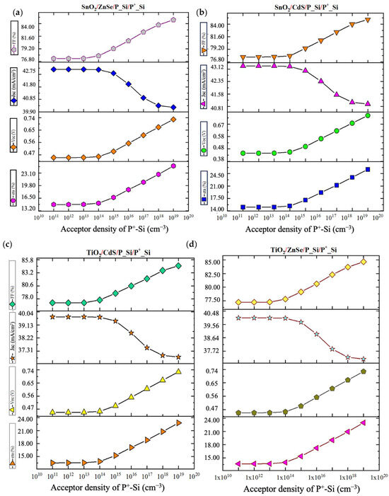 Influence of the doping density of the back surface field layer on photovoltaic performance of (a) SnO2/ZnSe/P_Si/P+_Si, (b) SnO2/CdS/P_Si/P+_Si, (c) TiO2/CdS/P_Si/P+_Si, and (d) TiO2/ZnSe/P_Si/P+_Si.