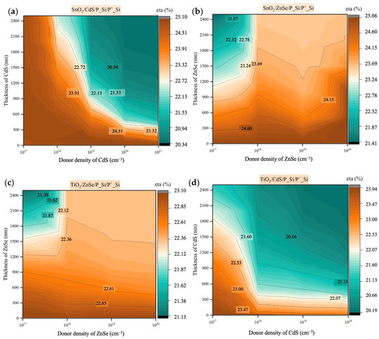 Contour graphs of heterojunction solar cell performance parameter dependency on defect density and thickness of ETL for (a) SnO2/CdS/P_Si/P+_Si, (b) SnO2/ZnSe/P_Si/P+_Si, (c) TiO2/ZnSe/P_Si/P+_Si, and (d) TiO2/CdS/P_Si/P+_Si.