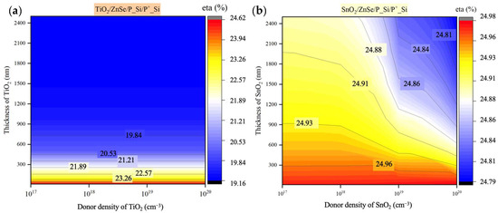 The fill factor remained almost constant up to 1016 cm−3 and then significantly increased for all the configurations. At 1019 cm−3 the conversion efficiency reached 24.94% for SnO2/ZnS/p_Si/p+_Si, 25.67% for SnO2/CdS/p_Si/p+_Si, 22.77% for TiO2/CdS/p_Si/p+_Si, and 22.96% for TiO2/ZnSe/p_Si/p+_Si.