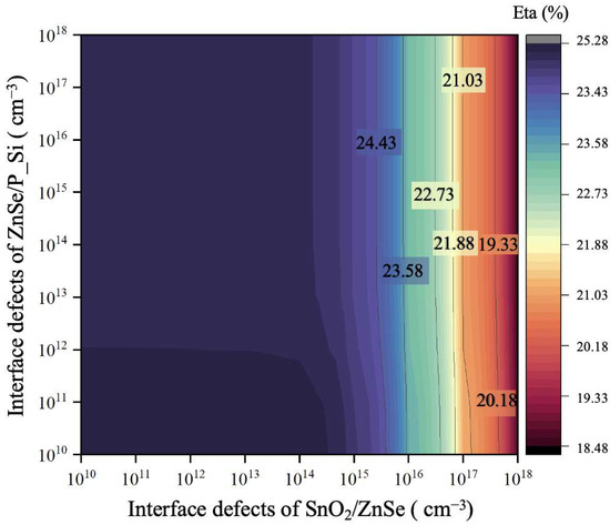 The findings demonstrated that interface defects between ZnSe/P_Si exert a lesser influence on the solar cell’s performance, unlike the SnO2/ZnSe interface, where there is a considerable impact. A rise in interface defects between SnO2/ZnSe results in a decline in efficiency. In the subsequent investigation, values of 1014 cm−3 and 1015 cm−3 were considered interface defect densities for ZnSe/P_Si and SnO2/ZnSe, respectively.
