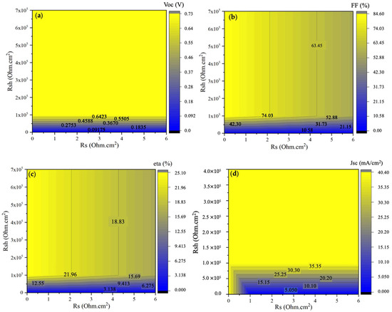 Influence of series and shunt resistances on photovoltaic performance: (a) Voc, (b) FF, (c) eta, and (d) Jsc.