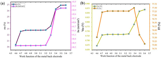 The photovoltaic parameters of the suggested cell are analyzed as a function of the work function of the back contact, as shown in Figure 10. The purpose of this analysis is to comprehend the practicality of a back contact in the selected device. Indeed, to generate a modest integrated potential at the rear contact, it is imperative to use a material with an appropriate work function at this location.