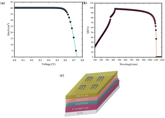 (a) J-V characteristics, (b) QE curves, and (c) baseline structure solar cell for the final device.