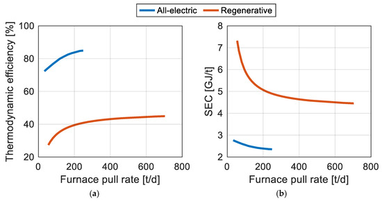Comparison of all-electric and regenerative furnaces: (a) thermodynamic efficiency, (b) SEC. Data from [24,36].