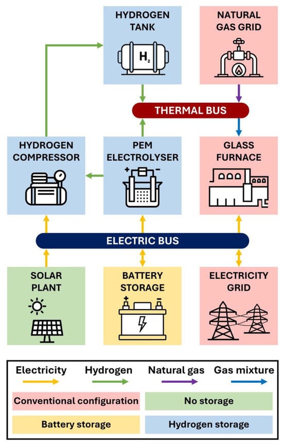 The layout of the overall system under consideration is shown in Figure 3 for four different configurations. The pink elements represent the conventional configuration of a hybrid glass furnace, where the fuel burners and boosting electrodes are fed from the natural gas and electricity grids, respectively. In green, a basic integration configuration consists of the furnace’s direct integration with a renewable energy plant consisting of PV modules. In yellow, the battery storage integration scenario implements energy storage to shift surplus energy during peak hours to hours where generation decreases. In blue, the hydrogen integration scenario includes a PEM electrolyzer to produce hydrogen and a pressurized hydrogen tank equipped with a hydrogen compressor. In this case, the electricity produced by the renewable plant can be streamlined to the furnace electrodes, sent to the electrolyzer to avoid excess renewable generation, or sent to the electricity grid.